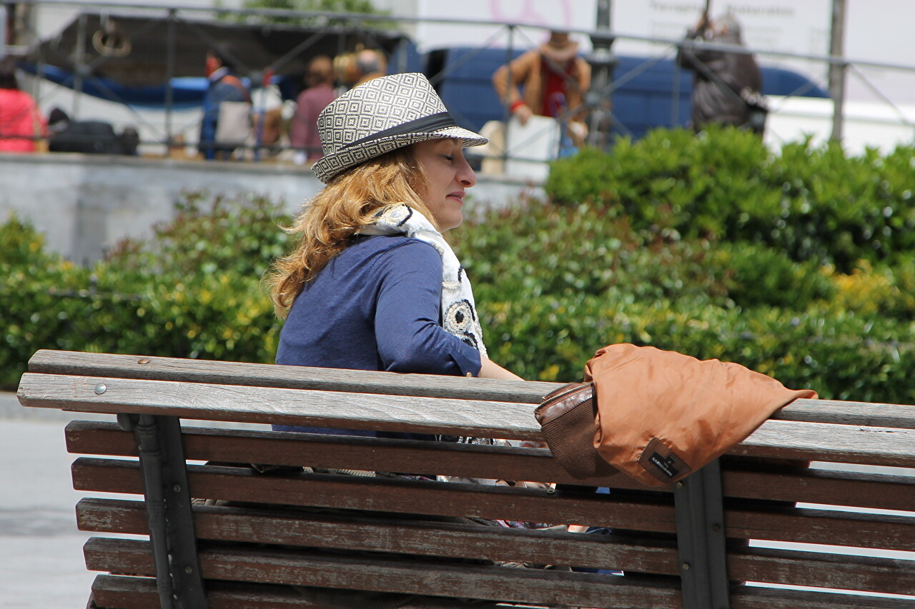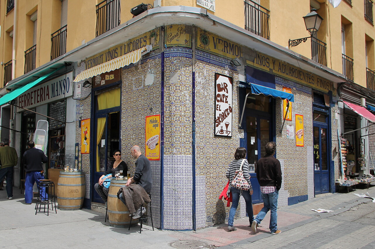 The square belongs to the El Rastro market area and usually on Sundays everything here is filled with market stalls and awnings. But today is a holiday Dos de Mayo, so residents of the surrounding neighborhoods are basking in the May sun in the park (May is actually cold in Madrid).