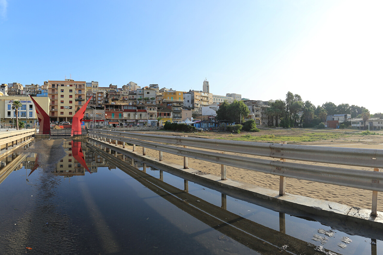 A long overpass built in the early 20th century leads from the beach into the sea. The structure served as a cargo pier, as the shallow waters prevented ships from approaching the shore.